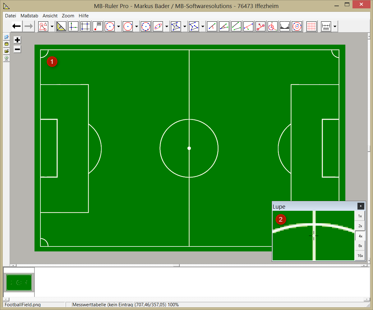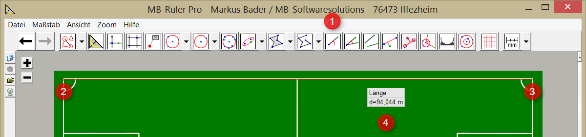 Um die Länge des Spielfeldes zu Messen, klicken Sie mit der Maus auf das Linien-Mess-Symbol (1).
