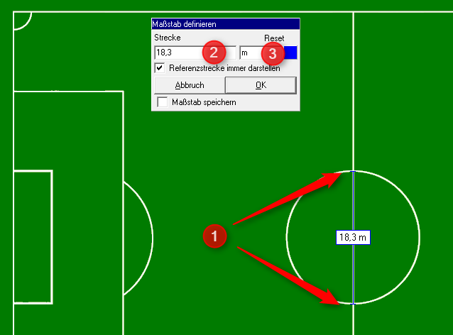 Anstoßkreises (1) und tragen Sie Länge (2) und Einheit (3) im Maßstabs-Definitions-Dialog ein.
