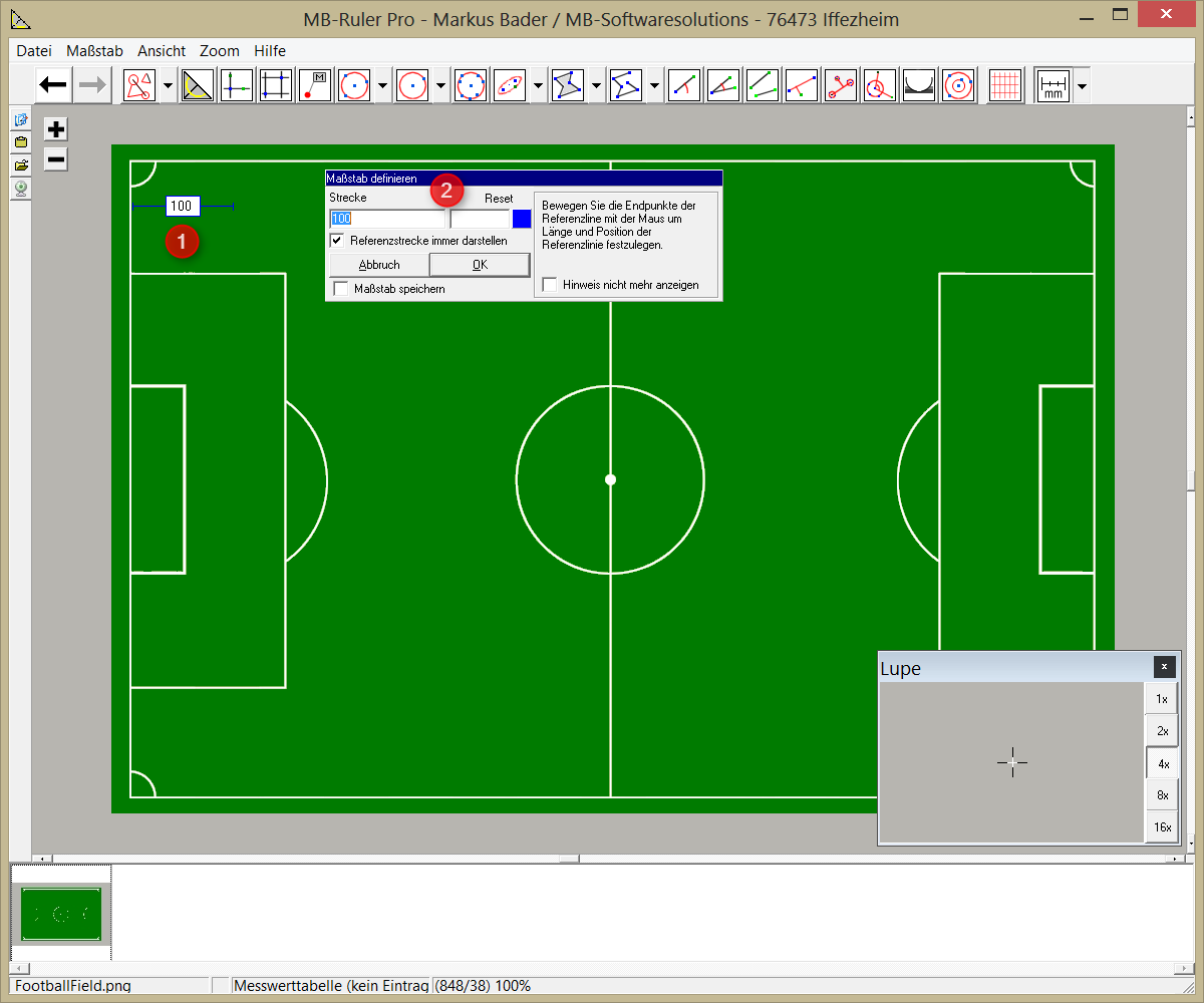 Die Maßstabs-Referenzstrecke (1) und der Maßstabs-Definitions-Dialog (2) werden eingeblendet.