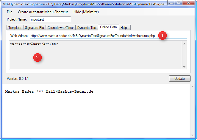The easiest way to configure MB-DynamicTextSignature for Thunderbird is to import an existing HTML signature file.